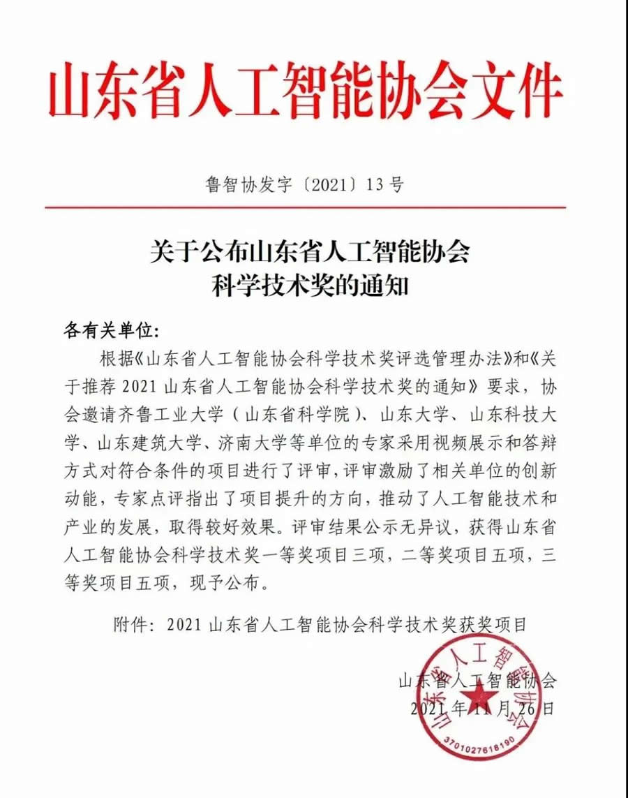 山東省人工智能協(xié)會科學技術(shù)獎是面向全省人工智能及相關(guān)行業(yè),主要獎勵在人工智能L域科學研究與普及、技術(shù)創(chuàng)新與開發(fā)、科技成果推廣應用和實現(xiàn)產(chǎn)業(yè)化方面取得卓著成績的企業(yè)。