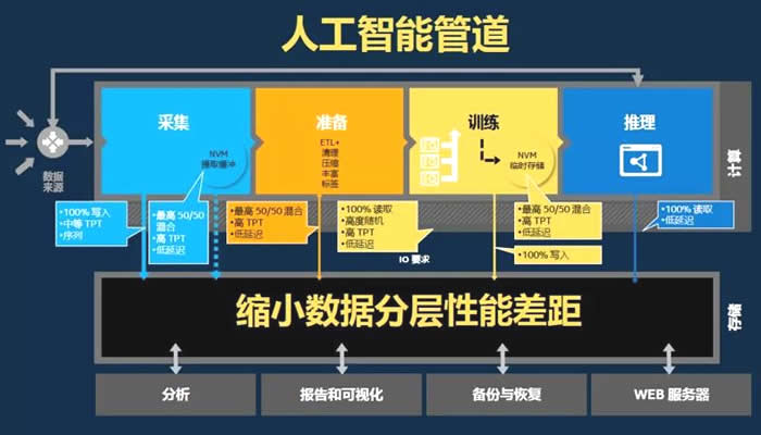 “工欲善其事,必先利其器”,要想發(fā)揮出AI人工智能技術(shù)的大威力,需要企業(yè)構(gòu)建強(qiáng)有力的IT基礎(chǔ)設(shè)施。這個(gè)設(shè)施不僅需要強(qiáng)有力的處理器、FPGA、GPU,也需要G性能的存儲(chǔ)設(shè)備,否則就會(huì)如普通電腦一般,因?yàn)闄C(jī)械硬盤傳輸速度慢,尋找數(shù)據(jù)的時(shí)間長,往往會(huì)成為整個(gè)系統(tǒng)性能的瓶頸,即使是SATA/PCIe NAND SSD,很多時(shí)候也跟不上AI數(shù)據(jù)處理的需求。倪錦峰先生介紹到,無論用于哪個(gè)行業(yè),人工智能的工作實(shí)際上主要由采集、準(zhǔn)備、訓(xùn)練和推理四部分組成。每個(gè)部分需要讀寫不同類型的數(shù)據(jù),工作負(fù)載也不盡相同,將給存儲(chǔ)設(shè)備帶來較大的挑戰(zhàn)。