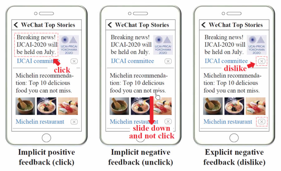 推薦系統(tǒng)在日常生活中被廣泛使用,為用戶獲取信息與娛樂提供便利。推薦系統(tǒng)算法往往基于用戶與系統(tǒng)的交互,這些交互行為可以大致分為以下兩類:顯式反饋與隱式反饋。顯式反饋從用戶對于物品的直接態(tài)度中獲取,例如評論中的一星到五星,或者微信看一看系統(tǒng)中的“不感興趣”按鈕。這類反饋能夠直接表達用戶的正向以及負向偏好,但是這類反饋的數(shù)量往往不多。隱式反饋從用戶的行為中間接獲得,例如用戶的點擊/不點擊行為。這些信息在推薦系統(tǒng)中往往是海量的,但是這些信息有著較多噪聲(用戶點擊的并不一定是他真正喜歡的)。另外,隱式反饋通常是以正反饋的形式出現(xiàn),推薦中的隱式負反饋存在巨大噪聲(未展現(xiàn)信息或者未點擊信息并不一定意味著用戶不喜歡這些內(nèi)容)。