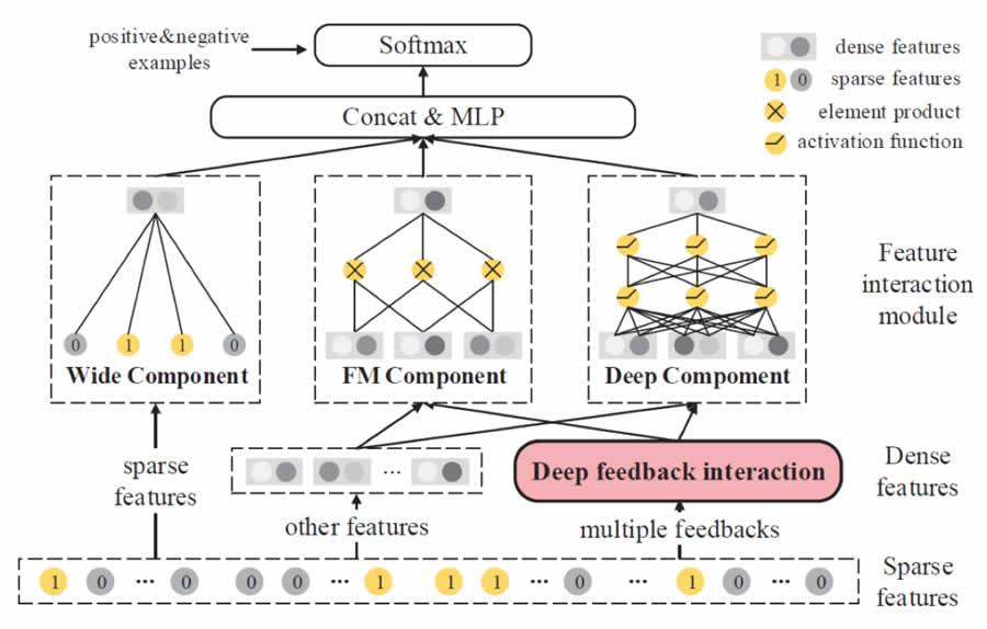 DFN模型主要分為三個階段:首先,deep feedback interaction module以用戶的多種反饋行為作為輸入,輸出用戶的反饋特征。然后,F(xiàn)eature Interaction Module進一步考慮用戶的其它特征和物品特征,使用FM、Deep和Wide層進行特征交互。后,輸出層使用CTR作為訓(xùn)練目標。圖2給出了DFN的整體結(jié)構(gòu)。