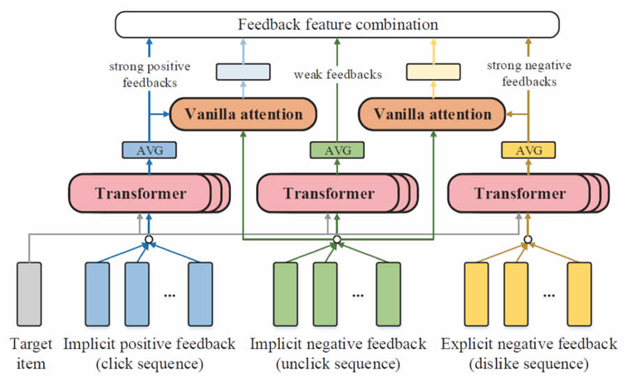 在推薦系統(tǒng)中,用戶的顯式反饋、隱式反饋、正反饋和負反饋都能夠反映用戶對于被推薦物品的偏好。這些反饋信息在推薦系統(tǒng)中十分有用。然而,現(xiàn)在的大規(guī)模深度推薦模型往往以點擊為目標,只看重以用戶點擊行為為代表的隱式正反饋,而忽略了其它有效的用戶反饋信息。