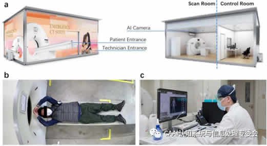 人工智能成像工作流程:許多現(xiàn)代的X光和CT系統(tǒng)都配備了用于病人監(jiān)護的攝像機。在COVID-19爆發(fā)期間,這些設備促進了非接觸掃描工作流程的實施。技術人員可以通過攝像機的實時視頻流從控制室監(jiān)控病人。在這種情況下,人工智能能夠通過從視覺傳感器獲取的數(shù)據(jù)中識別患者的姿勢和形狀來自動執(zhí)行操作,以確定佳掃描參數(shù)。這樣的自動化工作流程可以顯著提G掃描效率并減少不必要的輻射暴露。一個顯著的例子是基于由可視人工智能技術支持的移動CT平臺自動掃描工作流,如圖1(a)所示。移動平臺完全獨立,帶有基于人工智能的預掃描和診斷系統(tǒng)。它被重新設計成一個完全隔離的掃描室和控制室,以避免技術人員和患者之間不必要的互動。進入掃描室后,通過視覺和聽覺提示,指示患者在病床上擺好姿勢(圖1(b))。技術人員可以通過窗戶觀察,也可以通過掃描室內安裝在天花板上的人工智能攝像機傳輸?shù)膶崟r視頻,并在必要時校正病人的姿勢(圖1(c));颊叨ㄎ凰惴▽挠谜障鄼C[1]捕獲的圖像中自動恢復患者的3D姿態(tài)和完全重建的網(wǎng)格;3D網(wǎng)格,患者目標身體部分的掃描范圍和3D中心線都被估計并轉換成控制信號和優(yōu)化的掃描參數(shù),以供技術人員驗證。一旦核實,病床將自動對準ISO中心,并移入掃描架進行掃描。采集到CT圖像后,將對其進行處理和分析,以便進行篩查和診斷。2、AI圖像增強在COVID-19中的具體應用