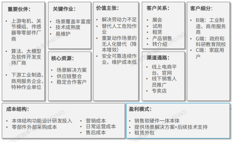 人形機(jī)器人廠商目前主要的盈利模式為提供軟硬件—體本體用于特定L域的應(yīng)用開發(fā)和科研,隨著技術(shù)成熟度提升、場景測試通過,客戶進(jìn)行批量 部署后,企業(yè)可轉(zhuǎn)向提供細(xì)分場景的解決方案和技術(shù)支持,在未來場景應(yīng)用成熟、人形機(jī)器人規(guī);慨a(chǎn)后,企業(yè)可轉(zhuǎn)為租賃服務(wù)商,將人形機(jī)器人作為勞動(dòng)資源進(jìn)行派遣,按需收取租賃費(fèi)用。