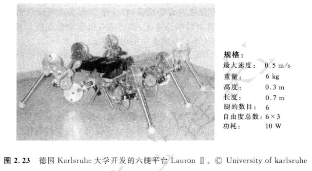 由于行走期間的靜態(tài)穩(wěn)定性,六腿結構在移動機器人學中已經很流行(圖2.23 和圖1.3),因而降低了控制的復雜性。在大多數(shù)情況下,各條腿有3個自由度,包括