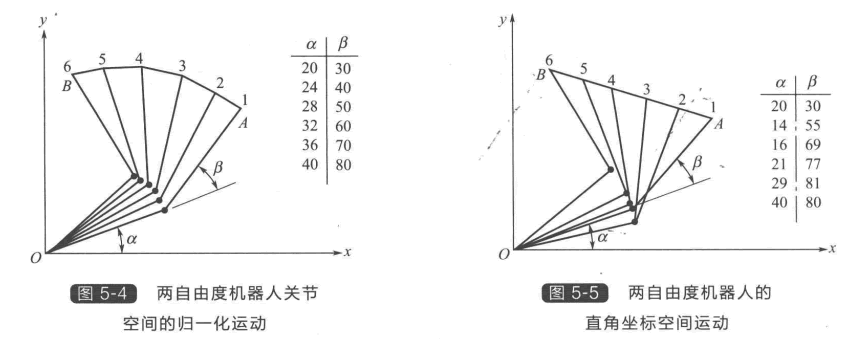 以兩自由度機器人為例,介紹在關(guān)節(jié)空間和在直角坐標空間進行軌跡規(guī)劃的基本原理。如圖5-3所示,要求機器人從A 點運動到B 點。機器人在A 點時的關(guān)節(jié)角為α=20°, β=30°。假設(shè)已算出機器人達到B 點時的關(guān)節(jié)角是α=40°,β=80°,同時已知機器人兩個關(guān) 節(jié)運動的Z大速率均為10°/s 。機器人從A 點運動到B 點的一種方法是使所有關(guān)節(jié)都以其Z大角速度運動,這就是說,機器人下方的連桿用2s 即可完成運動,而如圖5-3所示,上方的連桿還需 再運動3s 。 圖5-3中畫出了操作臂末端的軌跡,可 見其路徑是不規(guī)則的,操作臂末端走過的距離也是 不均勻的。