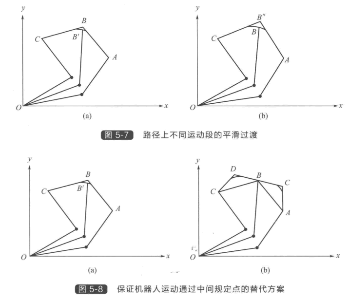 還有一種情況是軌跡規(guī)劃的路徑并非直線,而 是某個期望路徑(例如二次曲線),這時需要基于 期望路徑計算出每一段的坐標,并進而計算相應(yīng)的 關(guān)節(jié)量才能實現(xiàn)沿循期望路徑運動。至此只考慮了 機器人在 A 、B 兩點間的運動,而在多數(shù)情況下, 可能要求機器人順序通過許多點。下面進一步討論 多點間的軌跡規(guī)劃,并Z終實現(xiàn)連續(xù)運動。 圖5-6具有加速和減速段的軌跡規(guī)劃 如圖5-7所示,假設(shè)機器人從A 點經(jīng)過B 點運 動到C 點。一種方法是從A 向B 先加速,再勻速,接近B 時減速并在到達B 時停止,然后 由 B 到C 重復(fù)這一個過程。這一停一走的不平穩(wěn)運動包含了不必要的停止動作。一種可行 方法是將B 點兩邊的運動進行平滑過渡。機器人先抵達B 點(如果必要的話可以減速),然 后沿著平滑過渡的路徑重新加速,Z終抵達并停在C 點。平滑過渡的路徑使機器人的運動 更加平穩(wěn),降低了機器人的應(yīng)力水平,并且減少了能量消耗。如果機器人的運動由許多段組 成,所有的中間運動段都可以采用過渡的方式平滑連接在一起。但需要注意由于采用了平滑 過渡曲線,機器人經(jīng)過的可能不是原來的B 點而是B'點[如圖5-7(a) 所示]。如果要求機 器人準確經(jīng)過B 點,可事先設(shè)定一個不同的B"點,使得平滑過渡曲線正好經(jīng)過B 點[如圖 5-7(b) 所示]。另一種方法如圖5-8所示,在B 點前后各加過渡點D 和E, 使 得B 點落在 DE 連線上,確保機器人能夠經(jīng)過 B 點 。