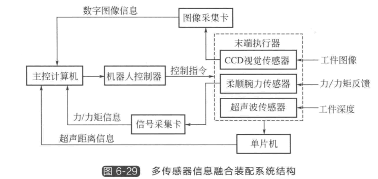 多傳感器信息融合裝配系統(tǒng)由末端執(zhí)行器、CCD視覺(jué)傳感器和超聲波傳感器、柔順腕力傳感器及相應(yīng)的信號(hào)處理單元等構(gòu)成。CCD視覺(jué)傳感器安裝在末端執(zhí)行器上,構(gòu)成手眼視覺(jué);超聲波傳感器的接收和發(fā)送探頭也固定在機(jī)器人末端執(zhí)行器上,由 CCD 視覺(jué)傳感器 獲取待識(shí)別和抓取物體的二維圖像,并引導(dǎo)超聲波傳感器獲取深度信息;柔順腕力傳感器安裝于機(jī)器人的腕部。多傳感器信息融合裝配系統(tǒng)結(jié)構(gòu)如圖6-29所示。