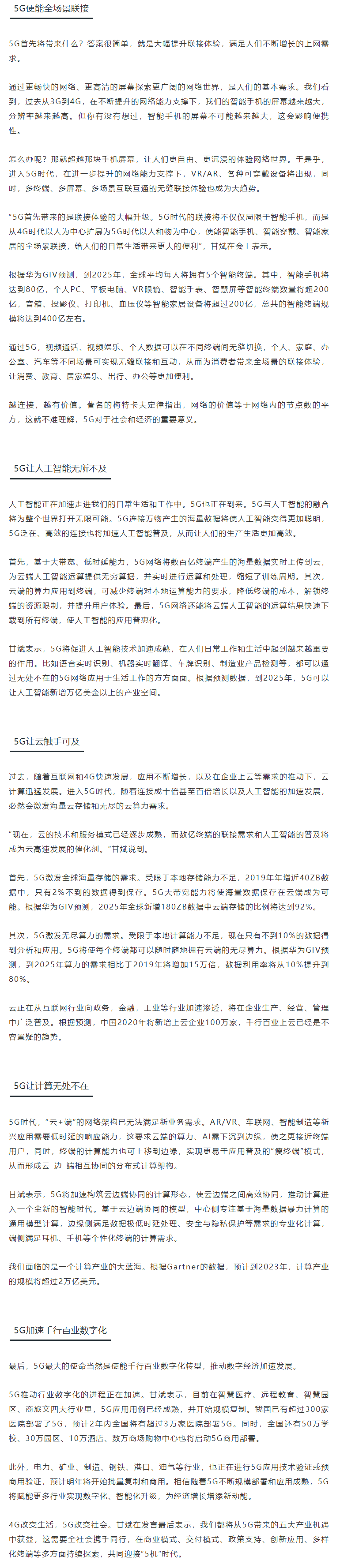 但很多人似乎只遠(yuǎn)盯著結(jié)果,卻忽視了過(guò)程。也就是說(shuō),在推動(dòng)全行業(yè)數(shù)字化轉(zhuǎn)型的過(guò)程中,5G作為新一代網(wǎng)絡(luò)基礎(chǔ)設(shè)施,還將本身進(jìn)一步推動(dòng)AI、云、計(jì)算等產(chǎn)業(yè)升級(jí)發(fā)展。