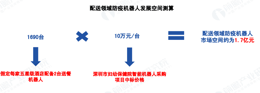 酒店場(chǎng)景下的初始客戶主要為G檔酒店,假設(shè)全國(guó)每一家五星級(jí)酒店均配備2臺(tái)送餐機(jī)器人,按照平均每臺(tái)10萬(wàn)元的價(jià)格計(jì)算,酒店服務(wù)場(chǎng)景下,防疫機(jī)器人的市場(chǎng)空間約為1.7億元。