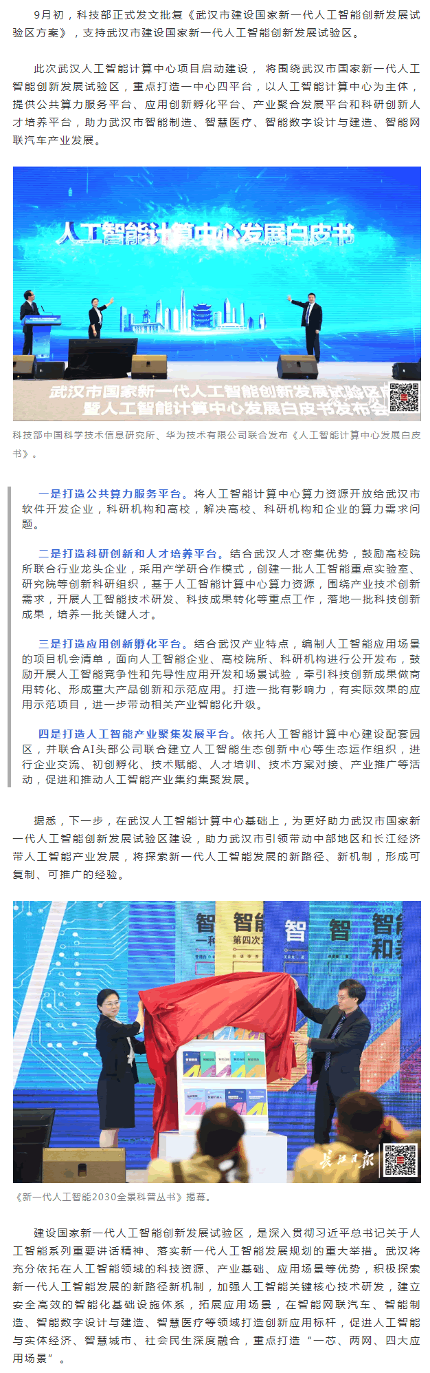 《人工智能計(jì)算中心發(fā)展白皮書(shū)》在武漢發(fā)布,具有標(biāo)志性意義,將引L武漢人工智能創(chuàng)新發(fā)展試驗(yàn)區(qū)建設(shè),推動(dòng)中國(guó)人工智能產(chǎn)業(yè)發(fā)展