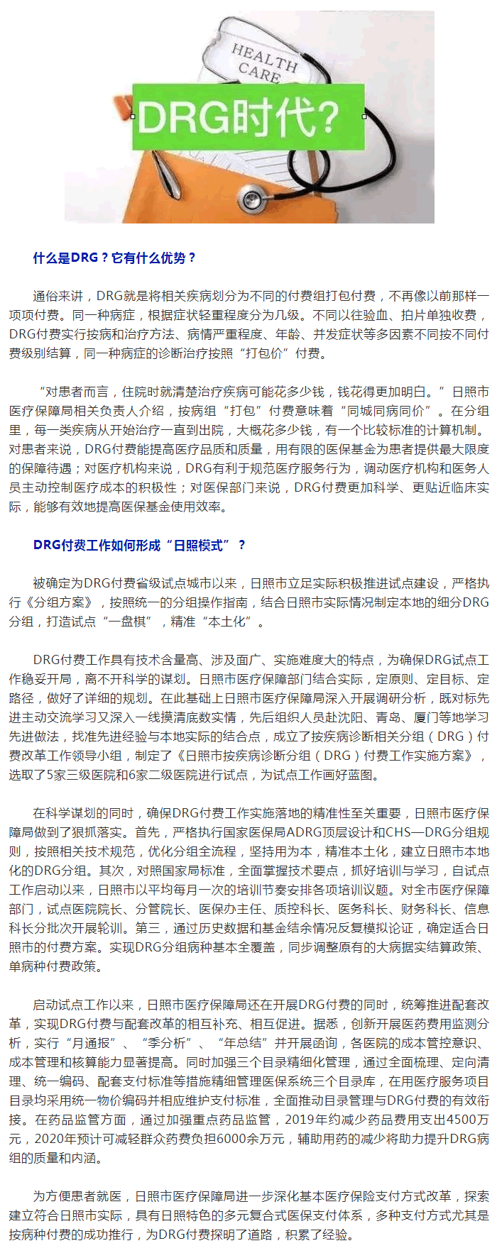 一直以來,傳統(tǒng)的“按項(xiàng)目付費(fèi)”方式被認(rèn)為是導(dǎo)致過度醫(yī)療、大處方的重要原因之一,在浪費(fèi)醫(yī)療資源的同時(shí)也加重了老百姓就醫(yī)負(fù)擔(dān),呼吁改革的聲音不斷。為健全醫(yī)保支付機(jī)制,激發(fā)醫(yī)療機(jī)構(gòu)規(guī)范行為、控制成本的內(nèi)生動力,去年5月,國家醫(yī)保局啟動按疾病診斷相關(guān)分組(DRG)付費(fèi)試點(diǎn),山東省在組織青島市參加國家試點(diǎn)的同時(shí),首批選取10個(gè)市開展DRG付費(fèi)省級試點(diǎn),日照市位列其中。