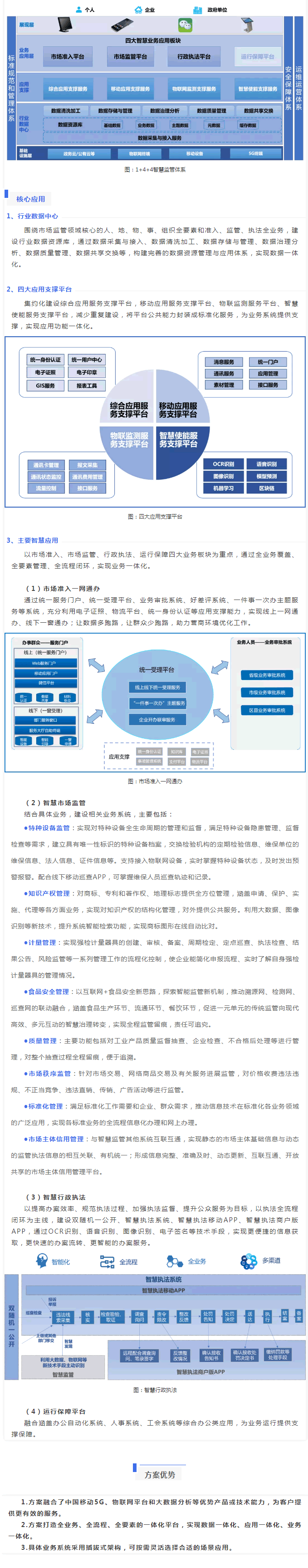 系統(tǒng)以市場準(zhǔn)入一網(wǎng)通辦,加強(qiáng)市場監(jiān)管智慧水平,提升行政執(zhí)法效能為核心訴求,充分利用5G、物聯(lián)網(wǎng)、移動互聯(lián)網(wǎng)、大數(shù)據(jù)等技術(shù)手段,打造智慧監(jiān)管一體化平臺,助力市場準(zhǔn)入、監(jiān)管、執(zhí)法業(yè)務(wù)改革與發(fā)展。