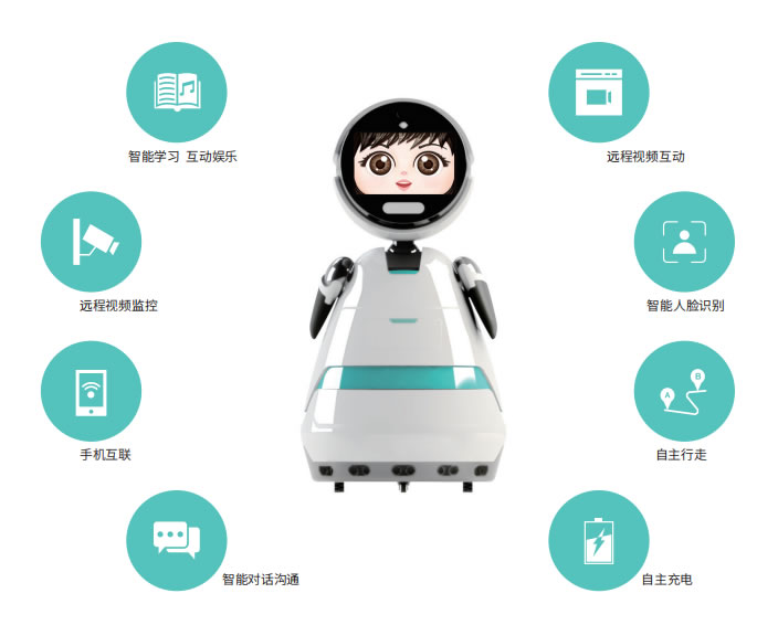 智能陪伴機(jī)器人采用機(jī)器人視覺(jué)系統(tǒng)、深度語(yǔ)音交互系統(tǒng)、先進(jìn)的語(yǔ)音引擎,搭載環(huán)形麥克風(fēng)陣列,運(yùn)用聲控識(shí)別、語(yǔ)義理解、人臉識(shí)別、情緒識(shí)別等關(guān)鍵技術(shù),在感知傳感器進(jìn)行穩(wěn)定準(zhǔn)確地行走、語(yǔ)音合成、理解與識(shí)別。機(jī)器人采用云平臺(tái)加本地化語(yǔ)音庫(kù)支持各種信息顯示,表情展示、觸摸輸入等人工交互過(guò)程。上位機(jī)采用 Linux 與 Android 操作系統(tǒng)通過(guò)串口方式與下位機(jī)通信,控制部分通過(guò) Can 通信方式連接各種傳感器采集外部信息。整個(gè)軟件系統(tǒng)包括機(jī)器人端、服務(wù)器端、手機(jī)端,通過(guò)網(wǎng)絡(luò)通信方式完成機(jī)器人互聯(lián)。產(chǎn)品具備娛樂(lè)、早教、陪護(hù)、安防等功能,可用于家庭陪護(hù)教育及遠(yuǎn)程監(jiān)控防護(hù)。