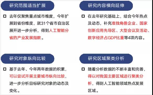 變化及亮點方面,今年AI指數(shù)在研究范圍、研究內(nèi)容、研究對象、研究區(qū)域等維度均進行了豐富和完善,包括從僅分析市級維度擴展到省級維度、增加國家創(chuàng)新應用先導區(qū)等指標、增加年度縱向比較和區(qū)域聚類分析等,可以說亮點紛呈。