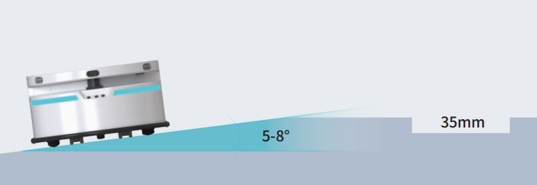 在平地上擁有穩(wěn)定可靠的導(dǎo)航避障性能,在面對(duì)坡度、過坎這些障礙物時(shí),也擁有穩(wěn)定的行走性能。擁有5-8°爬坡能力、10mm過坎G度能力,35mm寬坎間距離,滿足J大部分場(chǎng)景應(yīng)用。