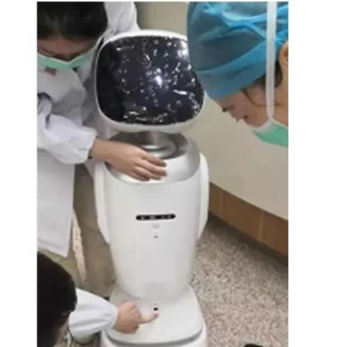 輪式移動機(jī)器人,可在無接觸情況下查看病人電子病歷,調(diào)取檢查報告;同時具有安撫病患情緒、心理疏導(dǎo)等功能。