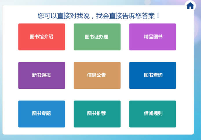 機器人屏幕主界面是分屏顯示,上部分展示各種媒體的入門(可點擊進入并操作),根據(jù)實際需求可設置圖書證辦理、圖書館介紹、精品圖書、信息公告、圖書查詢和借閱規(guī)則等導航圖標。